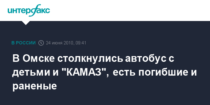 Москва. 24 июня. INTERFAX.RU - В Омске автобус с детьми врезался в грузовик "КАМАЗ". В результате ДТП погибло три человека, еще 16 детей были госпитализированы. "Столкновение произошло в 10:30 по местному времени на пересечении с проспектом Губина. В автобусе ехало более 30 детей и двое взрослых", - сообщили агентству "Интерфакс-Сибирь" в четверг в Управлении ГИБДД по Омской области.