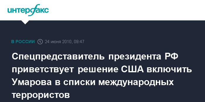 Москва. 24 июня. INTERFAX.RU - Решение США включить лидера чеченских боевиков Доку Умарова в перечень международных террористов поможет российским усилиям в сфере антитеррора на Северном Кавказе, заявил "Интерфаксу" в четверг спецпредставитель президента РФ по вопросам международного сотрудничества в сфере борьбы с транснациональной преступностью и терроризмом Анатолий Сафонов. "Речь идет о конкретной фигуре. Умарову повешен ценник "преступник" со всеми вытекающими последствиями. Это и мандат на международный розыск, и ордер на международные финансовые, оперативные и юридические санкции", - сказал Сафонов. "Это пример практического сотрудничества России и США в сфере антитеррора. Это, безусловно, плюс", - сказал он о внесении Умарова в американские "черные списки".