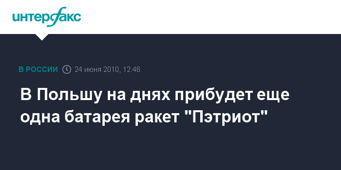 Москва. 24 июня. INTERFAX.RU - Очередная батарея американских ракет "Пэтриот" прибудет в Польшу в конце июня - начале июля, сообщает польский телеканал ТВН24, который приводит заявление министерства народной обороны республики.