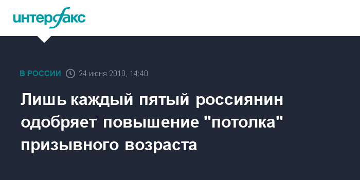 Москва. 24 июня. INTERFAX.RU - Большинство россиян (67%) не поддерживают инициативу продления призывного возраста до 30 лет, показал всероссийский опрос, проведенный 22-23 мая ВЦИОМ. Причем 44% опрошенных совершенно не поддерживают подобных мер. В первую очередь это сторонники ЛДПР (72%) и "Единой России" (71%), респонденты в возрасте до 44 лет (70-73%), жители центральных регионов (71%).