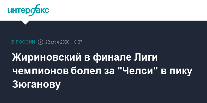 Москва. 22 мая. INTERFAX.RU - Лидер ЛДПР Владимир Жириновский посетил финал Лиги чемпионов УЕФА, в котором болел за футболистов лондонского "Челси", сообщает пресс-служба партии. Жириновский пояснил, что сделал выбор в пользу футбольного клуба Романа Абрамовича по двум причинам: "Во-первых, у них есть хоть какая-то связь с Россией, владелец "Челси" - гражданин России, губернатор. Во-вторых, рядом находился Зюганов, который болел за "Манчестер Юнайтед" по классовому признаку".