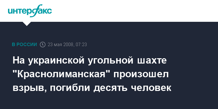 Донецк. 23 мая. ИНТЕРФАКС-УКРАИНА - На украинской угольной шахте "Краснолиманская" в Донецкой области взрыв метана унес жизни, по меньшей мере, десяти человек.