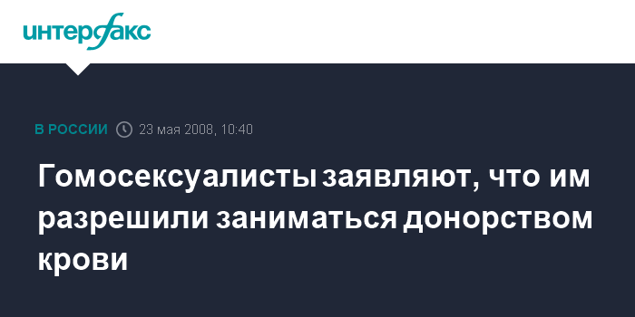 Москва. 23 мая. INTERFAX.RU - Минздравсоцразвития отменило отвод от донорства крови для лиц нетрадиционной ориентации, сообщает сайт представителей сексуальных меньшинств.