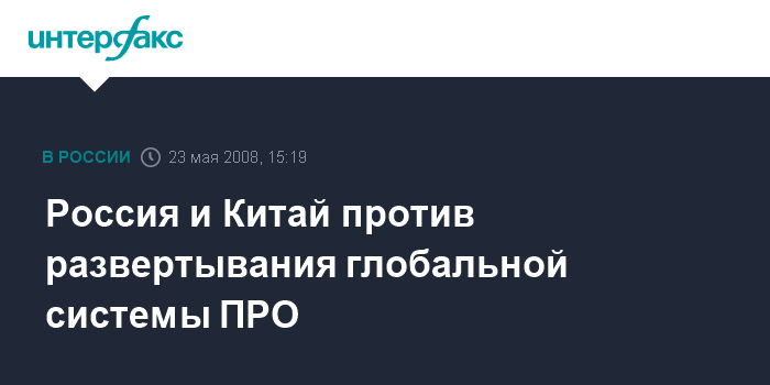 Москва. 23 мая. INTERFAX.RU - Глобальная система ПРО, развертывание такой системы в некоторых регионах мира не способствует поддержанию стратегического баланса и стабильности, отмечается в совместной российско-китайской декларации по международным вопросам.