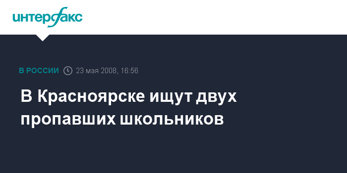 Москва. 23 мая. INTERFAX.RU - Сотрудники Свердловского РОВД Красноярска ищут двух 11-ти летних школьников, которые пропали вчера. Как сообщил источник в правоохранительных органах, два одноклассника не вернулись домой после уроков в одной из школ Свердловского района.