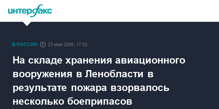 Москва. 23 мая. INTERFAX.RU - Hа военном аэродроме в Лодейном Поле Ленинградской области тушат пожар, сообщили "Интерфаксу" в пятницу в Северо-Западном региональном центре МЧС. На складе хранения авиационного вооружения в результате пожара взорвались несколько боеприпасов.