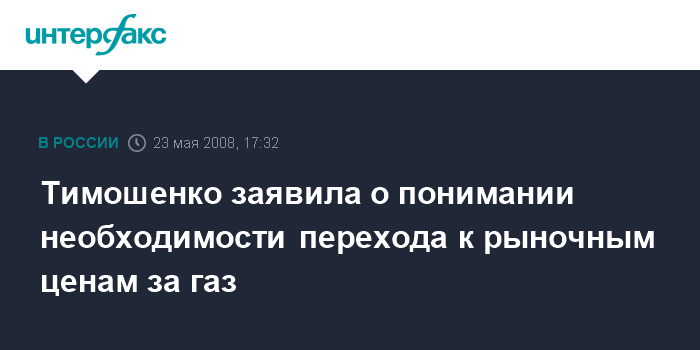 Москва. 23 мая. INTERFAX.RU - Премьер-министр Украины Юлия Тимошенко заявила, что в Киеве сознают необходимость постепенного перехода к рыночной цене за российский газ и ждут соответствующих переговоров.