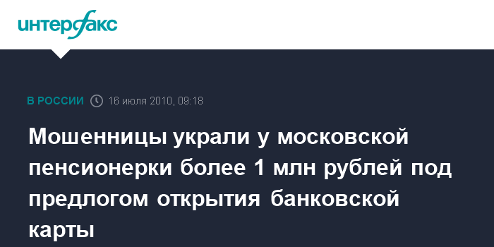 Накануне в милицию обратилась жительница Москвы 1927 года рождения с заявлением о хищении у нее большой суммы денег. По словам потерпевшей, в четверг около полудня на Шипиловской улице рядом с домом, где она живет, к ней подошли две женщины и предложили оформить банковскую карту, пообещав, что женщина получит ряд выгод.