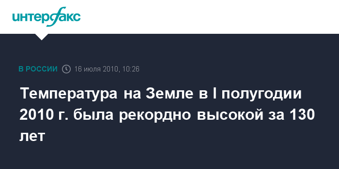 Средняя глобальная температура Земли за январь-июнь 2010 года составила 57,5 градуса по шкале Фаренгейта (14,17 градуса по Цельсию), что превышает рекорд ХХ века, зафиксированный в 1998 году, на 1,22 градуса по Фаренгейту.