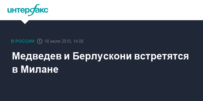 Москва. 16 июля. INTERFAX.RU - Президент РФ Дмитрий Медведев 23 июля прибывает в Милан с рабочим визитом по приглашению итальянского премьера Сильвио Берлускони, сообщила пресс-служба Кремля.
