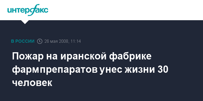 Тегеран. 26 мая. INTERFAX.RU - В иранском городе Арак здание фармацевтической фабрики было практически целиком разрушено во время сильного пожара. Погибли 30 человек и еще около 40 получили ранения, сообщает государственное информагентство ИРНА.