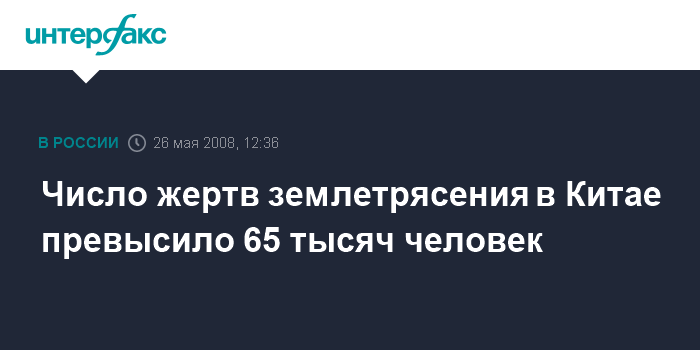 Москва. 26 мая. INTERFAX.RU - Количество погибших в результате разрушительного землетрясения в юго-западном Китае увеличилось в понедельник до 65 080 человек, сообщает открытый сайт официального агентства "Синьхуа".