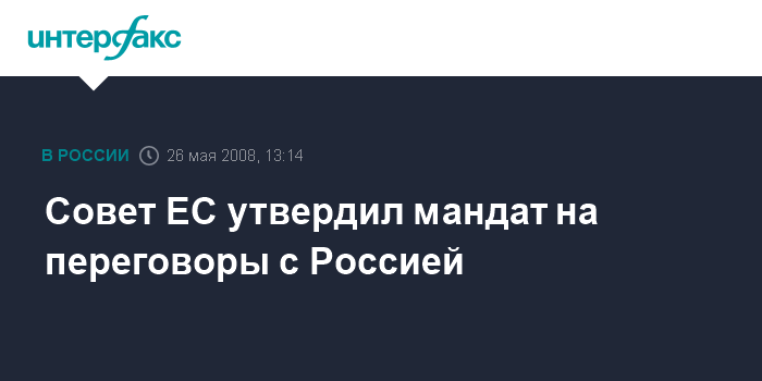 Москва. 26 мая. INTERFAX.RU - Совет министров иностранных дел ЕС первым пунктом повестки дня без обсуждения утвердил в понедельник мандат на переговоры о новом базовом соглашении ЕС-Россия, сообщил на экспресс-брифинге председательствующий на заседании министр иностранных дел Словении Димитрий Рупел. Это означает, что старт переговорам будет дан на саммите ЕС-Россия, который стостоится в Ханты-Мансийске в конце июня.