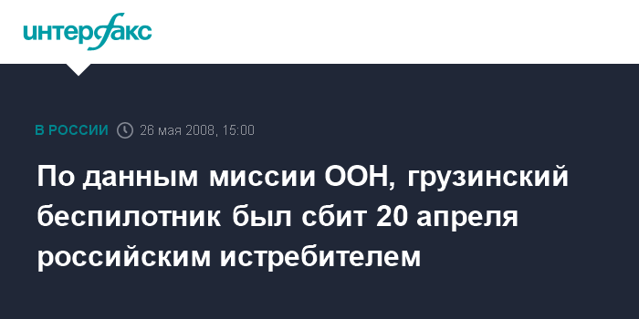 Москва. 26 мая. INTERFAX.RU - Миссия ООН по наблюдению в Грузии считает, что грузинский беспилотный самолет, сбитый 20 апреля над территорией Абхазии, был уничтожен российским истребителем.