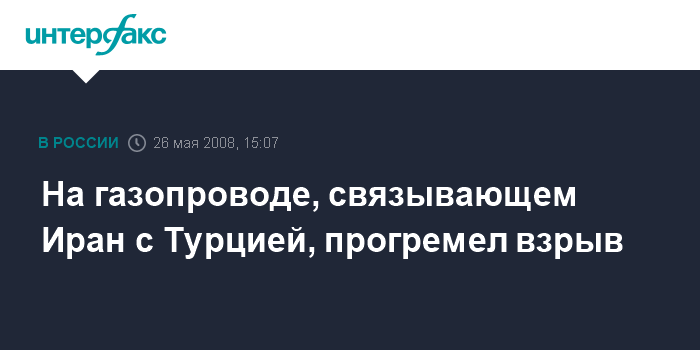 Москва. 26 мая. INTERFAX.RU - Взрыв на газопроводе, по которому иранский газ поступает в Турцию, прогремел в ночь на понедельник в турецкой провинции Агры, сообщили представители турецких властей.