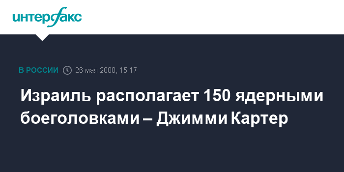 Москва. 26 мая. INTERFAX.RU - В арсенале Израиля находятся 150 ядерных боеголовок, заявил бывший президент США Джимми Картер, слова которого приводит в понедельник британская газета Times.