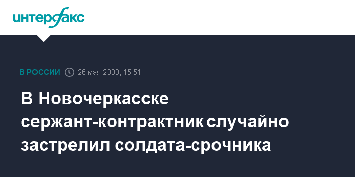 Москва. 26 мая. INTERFAX.RU - Под Новочеркасском (Ростовская область) случайным выстрелом из пистолета был убит солдат срочной службы. "В ходе прокурорской проверки установлено, что сержант-контрактник, будучи 23 мая помощником дежурного по батальону обеспечения учебного процесса Новочеркасского высшего военного училища связи, выстрелил в стену здания. Пуля рикошетом попала в голову солдата, призванного из Краснодарского края", - сообщил агентству "Интерфакс" в понедельник представитель военной прокуратуры Северо-Кавказского военного округа Натиф Гаджиметов.