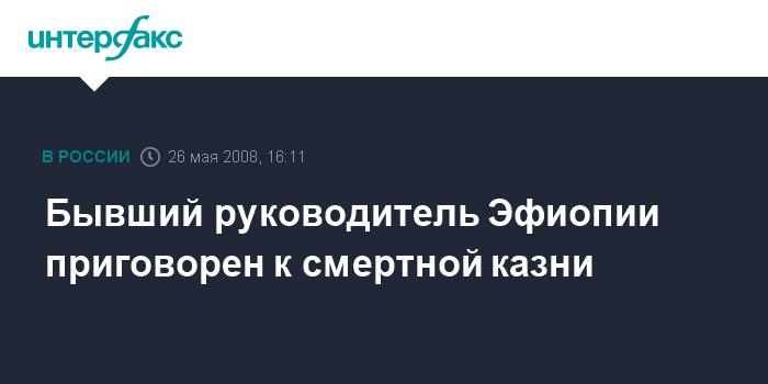 Йоханнесбург. 26 мая. INTERFAX.RU - Верховный суд Эфиопии приговорил в понедельник бывшего эфиопского руководителя Менгисту Хайле Мариама к смертной казни, сообщает южноафриканский новостной канал News-24.