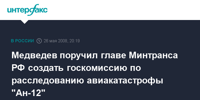 Москва. 26 мая. ИНТЕРФАКС - Президент России Дмитрий Медведев поручил министру транспорта Игорю Левитину создать комиссию по расследованию причин катастрофы самолета под Челябинском, повлекшей человеческие жертвы, сообщила пресс-служба Кремля.