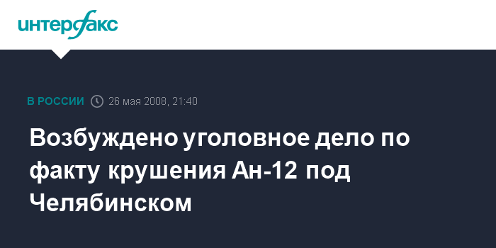 Москва. 26 мая. ИНТЕРФАКС - По факту авиакатастрофы в Челябинской области возбуждено уголовное дело.