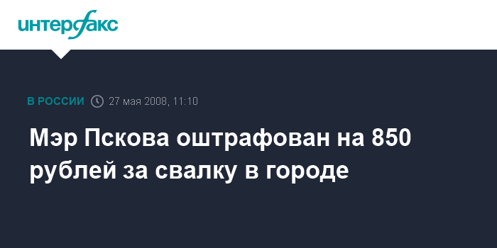 Москва. 27 мая. INTERFAX.RU - Мэр Пскова Михаил Хоронен оштрафован на 850 рублей за нарушение норм при эксплуатации свалки твердых бытовых отходов.