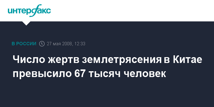 Москва. 27 мая. INTERFAX.RU - Количество погибших в результате разрушительного землетрясения в юго-западном Китае увеличилось в понедельник до 67 183 человек, сообщает открытый сайт официального агентства "Синьхуа".