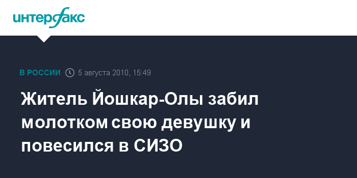 Йошкар-Ола. 5 августа. INTERFAX.RU - Житель Йошкар-Олы (республика Марий Эл) жестоко убил свою девушку, после чего повесился в камере СИЗО.