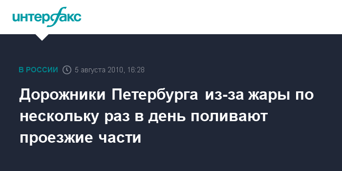 Санкт-Петербург. 5 августа. INTERFAX.RU - Дорожные службы Петербурга перешли на усиленный режим работы из-за жаркой погоды, сообщает в четверг пресс-служба городского комитета по благоустройству. Более 200 машин поливают проезжие части и тротуары несколько раз в сутки. Также дорожные службы подметают и пылесосят магистрали Петербурга. "В ежедневной уборке города задействовано свыше 350 единиц комбинированной техники: подметальной, уборочной, поливомоечной и вакуумной", - говорится в сообщении.