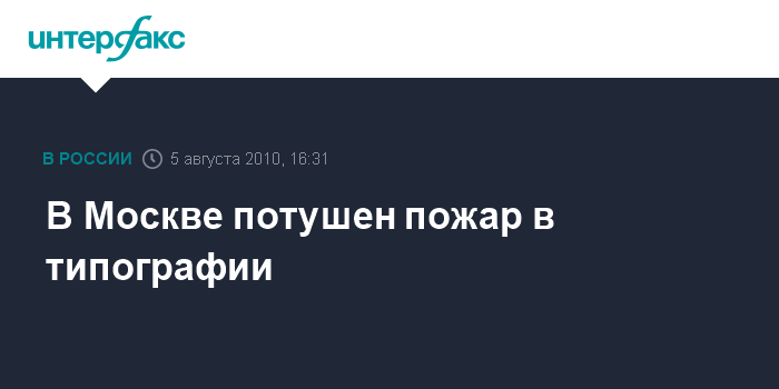 Москва. 5 августа. INTERFAX.RU - Ликвидирован пожар в типографии на юге Москвы, сообщили "Интерфаксу" в пресс-службе ГУ МЧС по Москве. "Пожар ликвидирован в 15:58, его площадь составила 100 кв. метров", - сообщили в пресс-службе. Там добавили, что в ходе тушения произошло частичное обрушение межэтажных перекрытий между вторым и третьим этажами.
