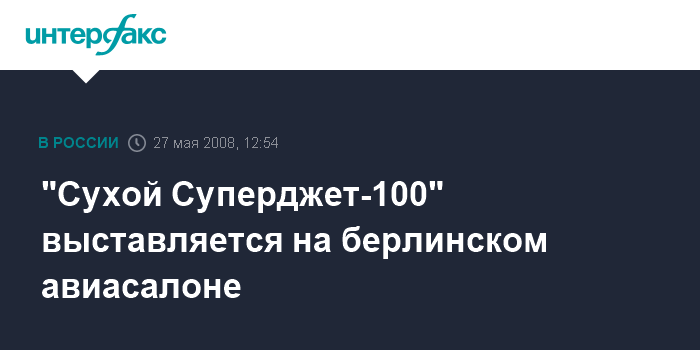 Москва. 27 мая. INTERFAX.RU - АХК "Сухой" представляет среднемагистральный пассажирский самолет "Сухой Суперджет-100" на открывшемся во вторник в Берлине 9-м международном аэрокосмическом салоне ИЛА-2008. Делегацию компании возглавляет ее генеральный директор Михаил Погосян.
