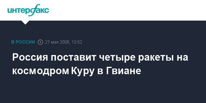 Москва. 27 мая. INTERFAX.RU - Роскосмос в начале 2009 г. завершит поставку оборудования и ракет для Гвианского космического центра в Куру (Латинская Америка). "Мы обязаны поставить четыре ракеты для проекта "Куру". Контракт уже подписан. Сейчас стоит вопрос, чтобы своевременно отправить четыре транспорта с оборудованием. Это главная наша задача", - сказал журналистам на открывшемся в Берлине авитасалоне "ILA-2008" руководитель Роскосмоса Анатолий Перминов.