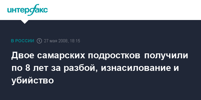 Москва. 27 мая. INTERFAX.RU - Суд Кировского района Самары приговорил к 8 годам лишения свободы в воспитательной колонии каждого из двоих подростков, за одну ночь совершивших два разбойных нападения, изнасилование и убийство (162 ч.2, 131 ч.2 п."б,в", 111 ч.4 УК РФ).