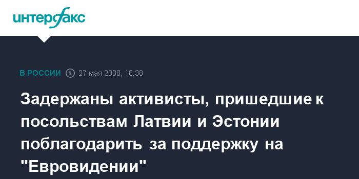 Москва. 27 мая. INTERFAX.RU - Пятеро активистов молодежного движения "Россия молодая" задержаны около посольства Латвии в Москве. "Наши активисты проводили серию пикетов около посольств Эстонии и Латвии, чтобы выразить благодарность жителям этих республик за поддержку России на "Евровидении-2008", - сообщила "Интерфаксу" пресс-секретарь движения Екатерина Федотова. Основными лозунгами акции стали: "Нет фашизму по телевидению, смотрите лучше "Евровидение", "Переписывать историю - фарс".