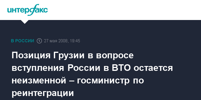 Тбилиси. 27 мая. ИНТЕРФАКС - Позиция Грузии по отношению ко вступлению Российской Федерации во Всемирную торговую организацию (ВТО) остается неизменной, заявил госминистр Грузии по реинтеграции Темур Якобашвили журналистам во вторник.