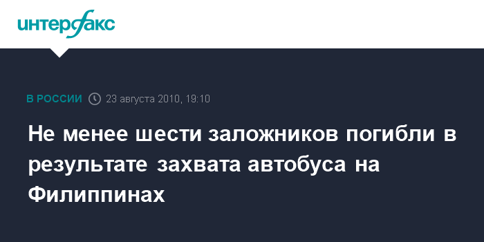 Вашингтон/Манила. 23 августа. INTERFAX.RU - Не менее шести из 15 гонконгцев, находившихся в захваченном бывшим полицейским в Маниле туристическом автобусе, погибли, сообщает в понедельник американская телекомпания NBC со ссылкой на местных медиков.