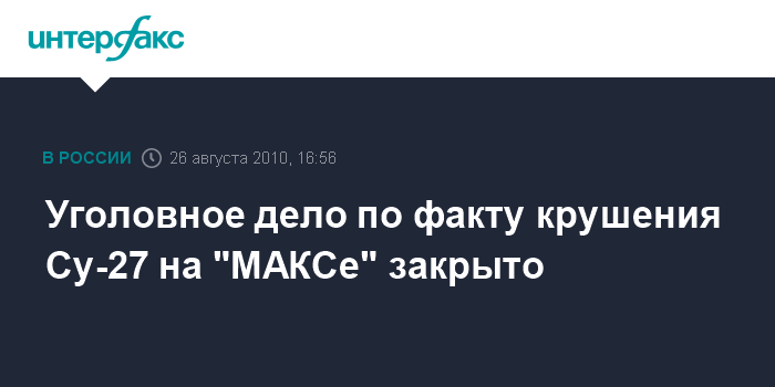 Москва. 26 августа. INTERFAX.RU - Военное следственное управление прекратило уголовное дело по факту крушения самолета Су-27 из отряда "Русские витязи" на авиасалоне "МАКС-2009"
