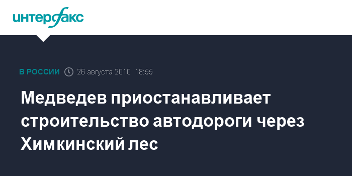 Сочи. 26 августа. INTERFAX.RU - Президент РФ Дмитрий Медведев принял решение приостановить реализацию постановления правительства о строительстве автодороги через Химкинский лес до проведения новых общественных и экспертных обсуждений этого вопроса.