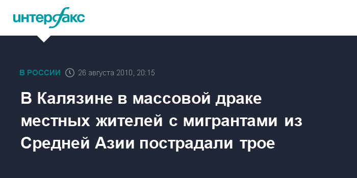 Тверь. 26 августа. INTERFAX.RU - После драки, которая произошла в городе Калязине Тверской области в ночь на 22 августа, из города вывезены незаконно проживавшие там мигранты из Центральной Азии, сообщили в четверг "Интерфаксу" в администрации района.