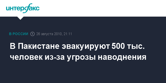Вашингтон. 26 августа. INTERFAX.RU - Правительство Пакистана в четверг предупредило около 500 тысяч жителей юго-западной провинции Синд, что они должны немедленно эвакуироваться из-за возможности нового наводнения, сообщает американская телекомпания CNN.