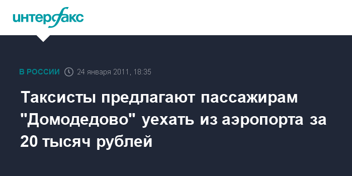 Москва. 24 января. INTERFAX.RU - Таксисты в аэропорту "Домодедово", где в понедельник произошел взрыв, подняли цены за поездку до 20 тыс. рублей.