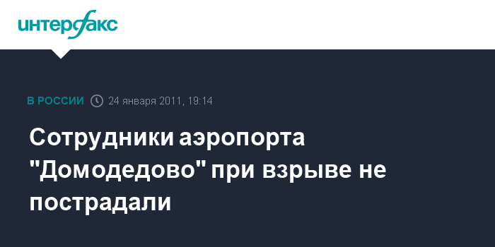 Москва. 24 января. INTERFAX.RU - Сотрудники аэропорта "Домодедово" при взрыве не пострадали, сообщила журналистам в понедельник в Москве пресс-секретарь аэропорта Елена Галанова.