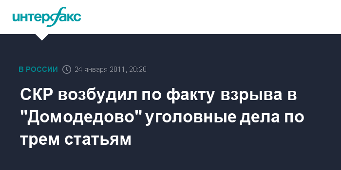 Москва. 24 января. INTERFAX.RU - СКР возбудил по факту взрыва в аэропорту "Домодедово" уголовные дела по трем статьям, заявил журналистам официальный представитель СКР Владимир Маркин.