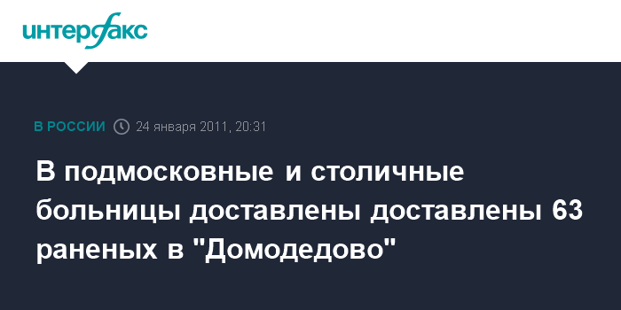 Москва. 24 января. INTERFAX.RU - По последним данным, в больницы госпитализированы 63 пострадавших во время взрыва в аэропорту "Домодедово", сообщает Минздравсоцразвития РФ.