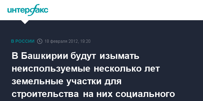 Уфа. 18 февраля. INTERFAX.RU - Власти Башкирии намерены изымать в пользу государства земельные участки в Уфе, которые долгое время не используются, и передавать их под строительство социального жилья и жилья экономкласса, заявил глава республики Рустэм Хамитов на "Прямой линии" по уфимскому городскому телеканалу в субботу.