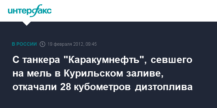 Южно-Сахалинск. 19 февраля. ИНТЕРФАКС-ДАЛЬНИЙ ВОСТОК - С аварийного танкера "Каракумнефть", севшего на мель в Курильском заливе, откачали уже 28 кубометров дизтоплива, сообщил агентству "Интерфакс-Дальний Восток" оперативный дежурный морского спасательного координационного подцентра "Южно-Сахалинск".