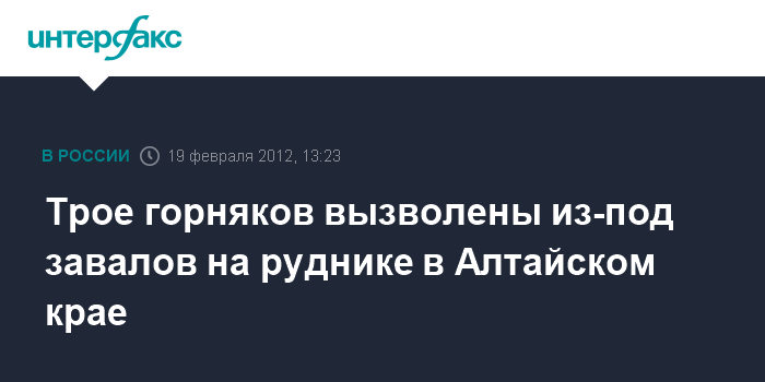 Барнаул.19 февраля. INTERFAX.RU - Трое горняков, находившихся под завалами в Потеряевском руднике в Алтайском крае, спасены, сообщает краевое управление МЧС. Травмированных в результате обвала породы нет. Работы по ликвидации последствий аварии продолжаются.