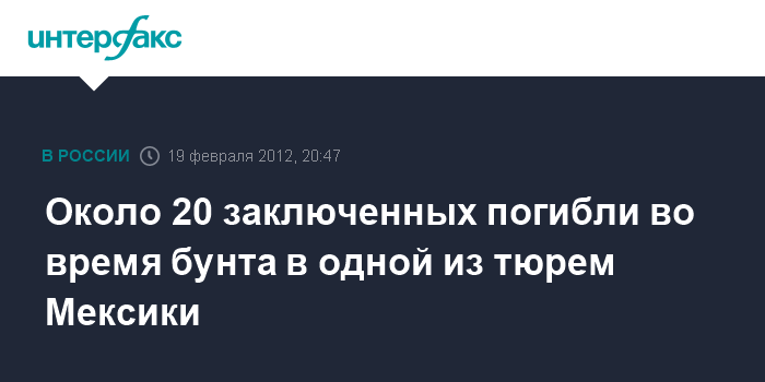 Лондон. 19 февраля. ИНТЕРФАКС - Беспорядки в воскресенье произошли в тюрьме города Монтере на севере Мексики, в результате около 20 человек погибли, сообщает британская телерадиовещательная корпорация Би-би-си.