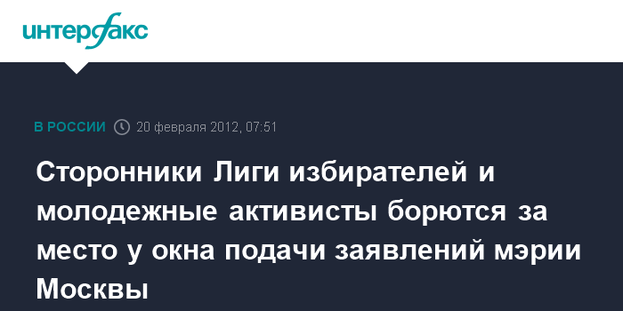 Сторонники Лиги избирателей и молодежные активисты борются за место у окна подачи заявлений мэрии Москвы