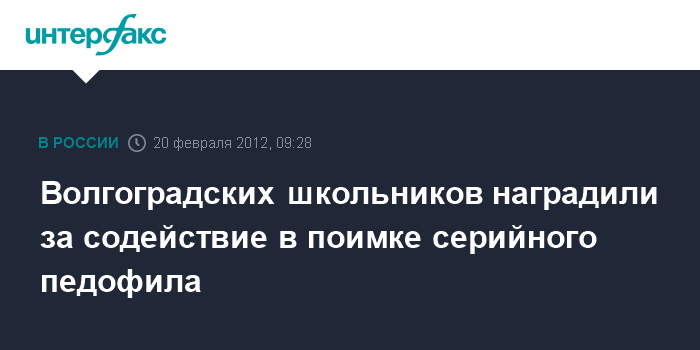 Волгоград. 20 февраля. INTERFAX.RU - В ГУ МВД по Волгоградской области состоялось награждение четырех старшеклассников, которые помогли полицейским задержать серийного педофила.