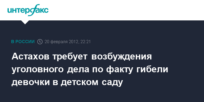 Москва. 20 февраля. INTERFAX.RU - Уполномоченный по правам ребенка при президенте РФ Павел Астахов требует возбудить уголовное дело в связи с гибелью трехлетней девочки в московском детском саду. "Должно быть незамедлительно возбуждено уголовное дело в связи с гибелью девочки. Всем детсадам необходимо усилить меры безопасности", - написал Астахов в своем блоге в "Твиттере" в понедельник. "Главная задача воспитателей - постоянно видеть каждого ребенка и предупреждать любые неожиданности: защищать, охранять и беречь", - отметил Астахов.